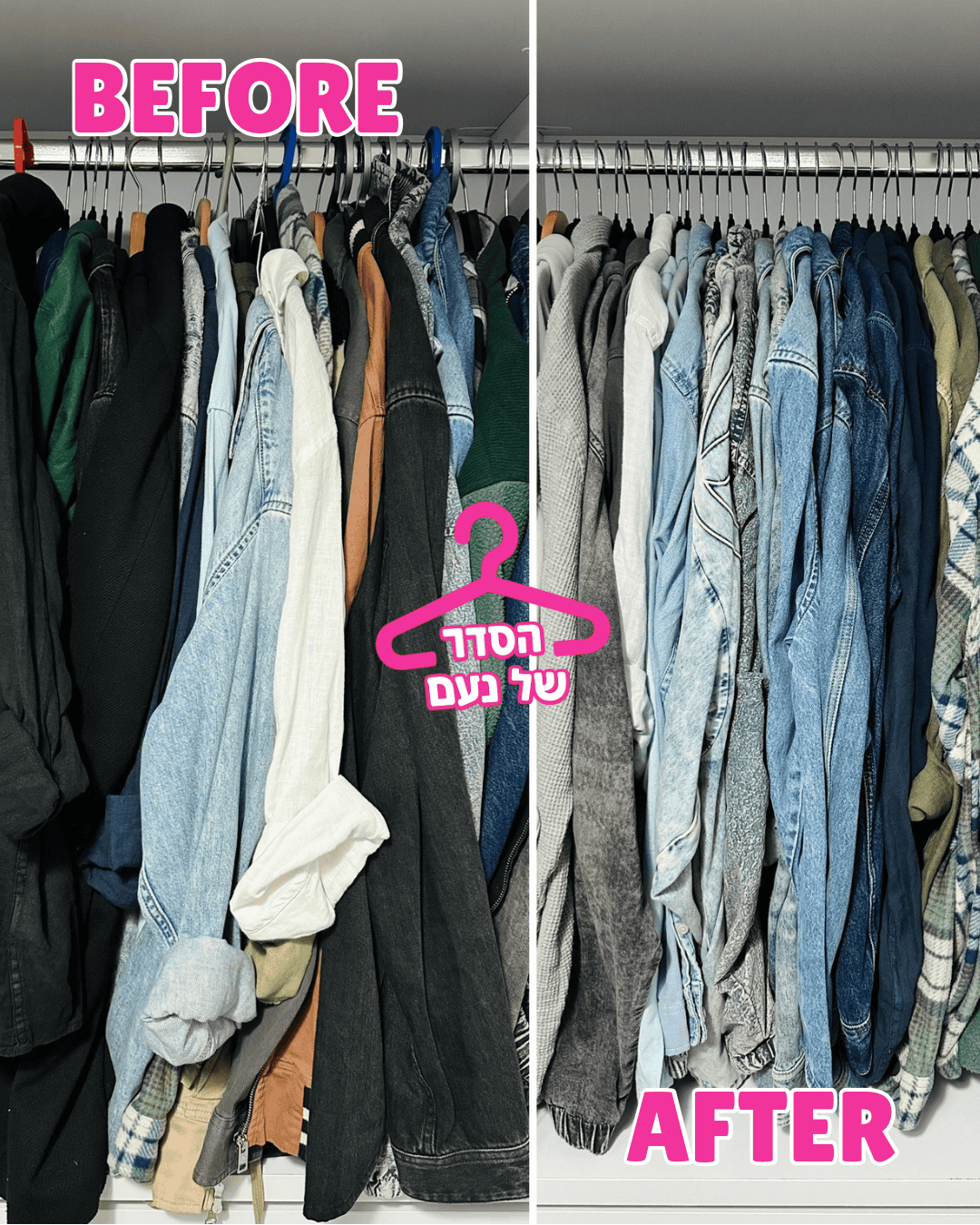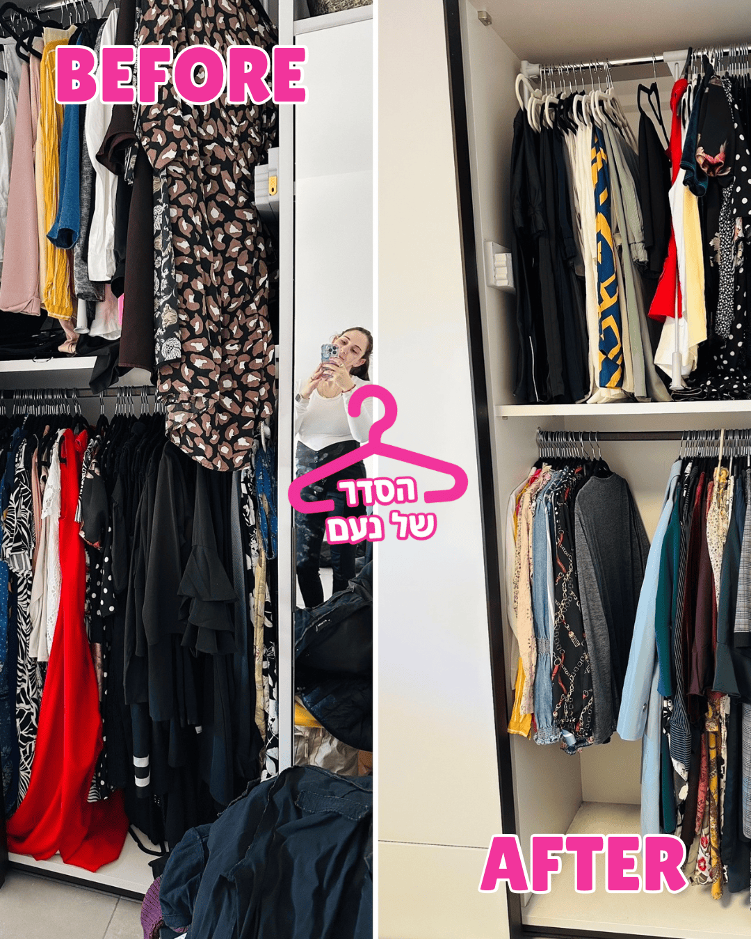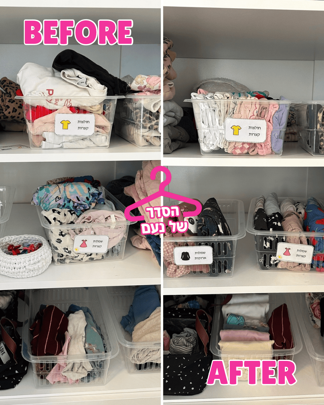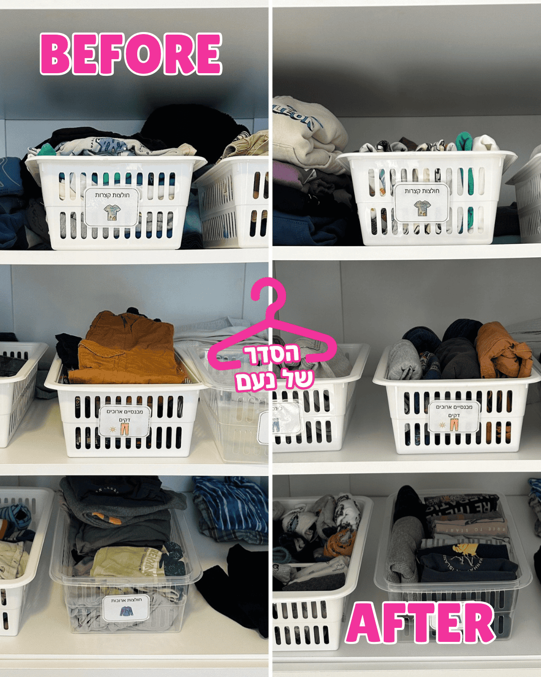 מיון, סידור וארגון ארונות כך שכל פריט מקבל מקום ברור ונוח לסדר שנשאר לאורך זמן.